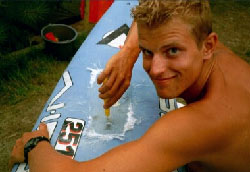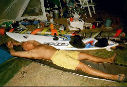 het was zwaar benauwd en denk wel 36 graden ofzow om 19:30.. we besloten de spullen bij elkaar te rapen.. we gingen voor alles of niets.. dus 4.9 en 4.7 gepakt en de hardcore wave boardjes.... ze zaten ons raar aan te kijken op de camping maargoed dat deden ze heel de week al :-) en ineens kwam er een vlaagje van denk 3 bft.. en onze harten begonnen harder te kloppen (ohw wat poëtisch) en de wind was weer weg.. hmm.. rare gevoel bleef en het MOEST gewoon gaan waaien.. je kon het bijna proeven.. heel vaag.. wij naar het strand gelopen .. we werden al nageroepen door de golfsurfers.. aahhh windsurfing jaahhh... maar schijt aan de rest.. het gaat waaien... PUNT... |