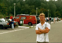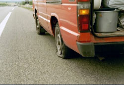 zondagochtend vol goede moet vertrokken om uurtje of 6.. superdik allemaal... toen lekker doorgestoomd tot tussen Parijs en La Rochelle.. Kris reed en ik zat lekker een surfmagazinetje te lezen toen ons ineens een beetje opviel dat de bus begon te trillen... hmmmz.,.. Eerst sow van.. nja zal wel straks ff kijken.. toen ineens heel erg te trillen.. toen besloten dat we maar beter ff de vluchtstrook van dichtbij konden gaan bekijken en op dat moment KABOAAMMEMEMEKrrrrrrrrrrgrrrrr rpeieeipegfgdfg... kortom klapppband :-) |