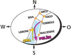 Van het internet plukte ik het volgende: “Lake Garde is famous for its thermal winds. In the morning the wind blows from the north (Pelèr), and in the afternoon from the south (Ora). During the switch from Pelèr to Ora conditions are ideal for beginners. During the day the Ora gets steadily stronger good for every surflevel. Surfcenters are located on the famous “bottle neck”, the windiest point of Lake Garda. Thanks to the funnel effect this area can actually guaranty wind for over 85% of the duration of the season”